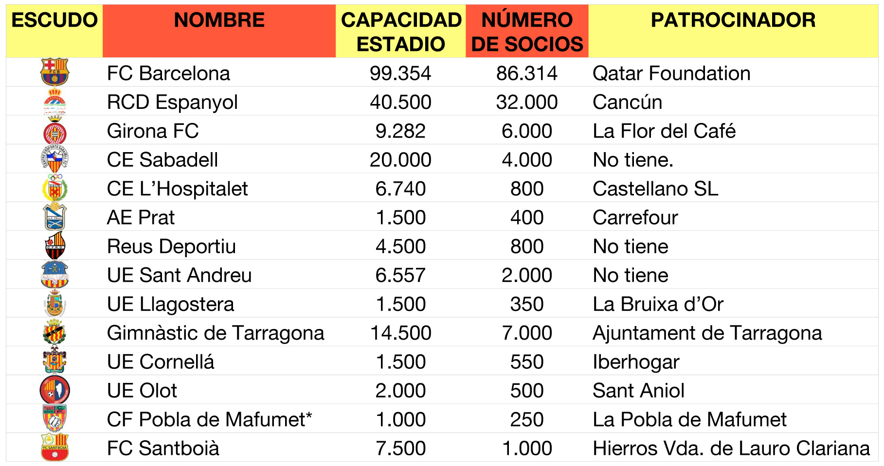 He realizado el listado de los catorce mejores equipos de Cataluña en la actualidad. Teniendo en cuenta que el nuevo estado tiene unos siete millones de habitantes, y que la liga belga tiene dieciséis equipos sobre una población de unos diez millones, catorce me ha parecido un número adecuado. Si el Grupo 5 de la Tercera División de la liga española terminara hoy (por el viernes pasado), el primer campeonato nacional de Lliga Catalana (que así se llamará a falta de conocer el sponsor) lo configurarán los siguientes equipos: