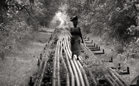 Una mujer camina sobre oleoductos. Fotografía: George Osod