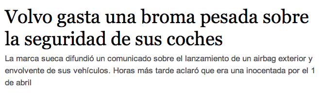 Pinchen en el enlace del tuit que pinchen, les llevará al mismo titular: «Volvo celebra el ‘April Fools Day’ anunciando un falso airbag». La noticia original ha sido eliminada, pero he podido capturarla en una vista previa de Google antes de que desapareciera de su caché.