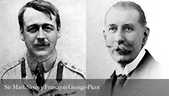 El acuerdo Sykes-Picot, fue un acuerdo secreto firmado por Francia e Inglaterra con la aquiescencia de Italia y Rusia para repartirse Oriente Medio, que entonces pertenecía al Imperio Otomano y que se había aliado con Alemania en la guerra. Al mismo tiempo, los británicos alentaron una rebelión del árabe Husayn ibn Ali, jerife de La Meca, que se levantó contra los otomanos. A cambio, los británicos prometían un Estado árabe desde Siria hasta Yemen, promesa que, por otro lado, no tenían intención de cumplir. Casi simultáneamente, a finales de 1917, de nuevo los británicos, hicieron público su apoyo a la creación de un Estado judío a través de la Declaración de Balfour.